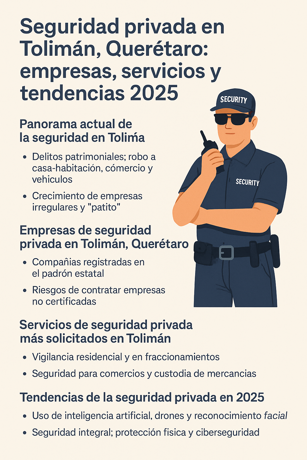 La seguridad privada en Tolimán, Querétaro se ha convertido en una necesidad urgente para familias, comercios y fraccionamientos. En 20...